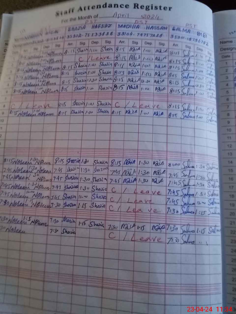| CNIC | Full Name | Designation | R/C | Absence During Last Calender Month |