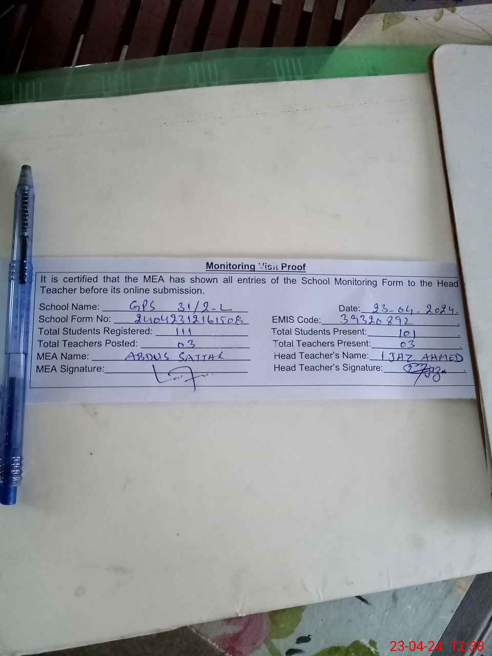 | EMIS Code: 39320892 | Name of School: GPS CHAK NO. 31/2-L | |||