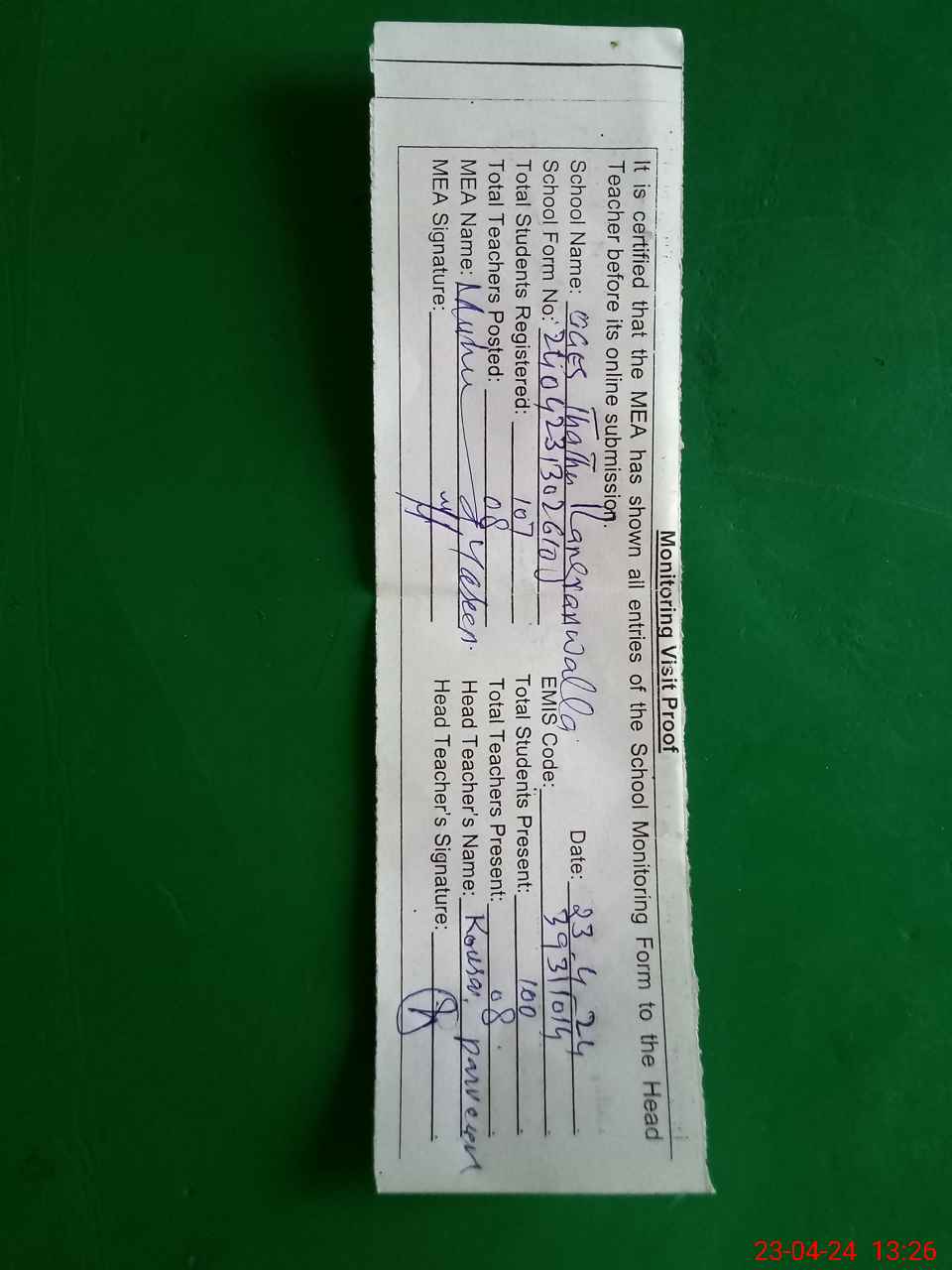 | Attendance Register | Head Teacher | MEA with School | Visit Proof |