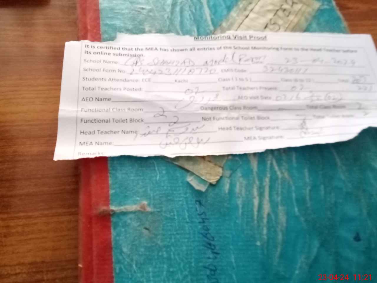 | Attendance Register | Head Teacher | MEA with School | Visit Proof |
