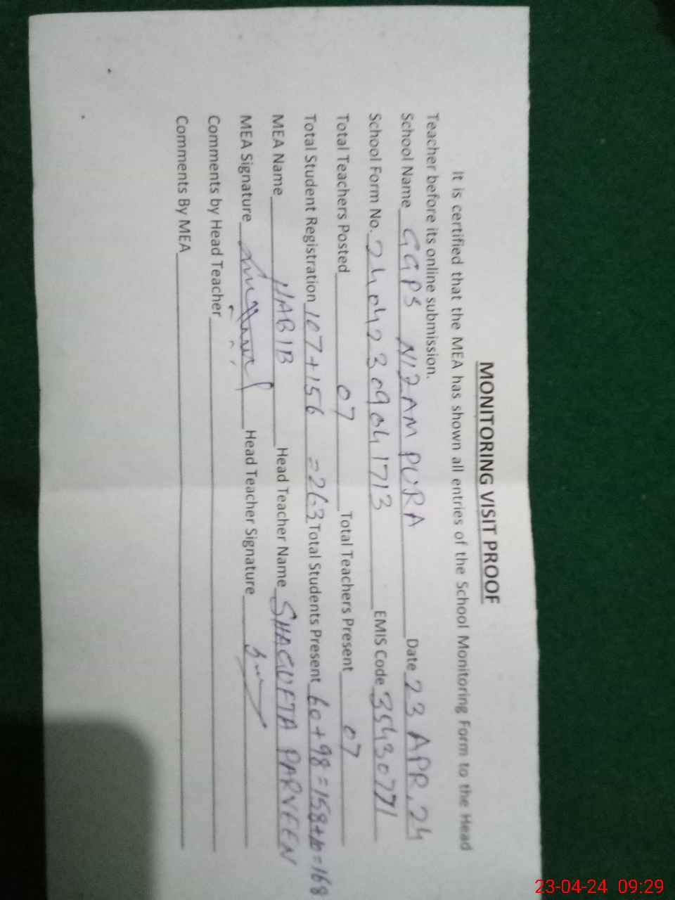 | Attendance Register | Head Teacher | MEA with School | Visit Proof |
