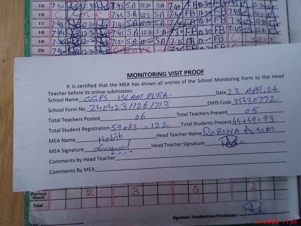 | Attendance Register | Head Teacher | MEA with School | Visit Proof |