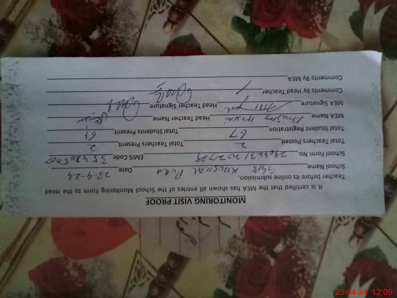 | Attendance Register | Head Teacher | MEA with School | Visit Proof |