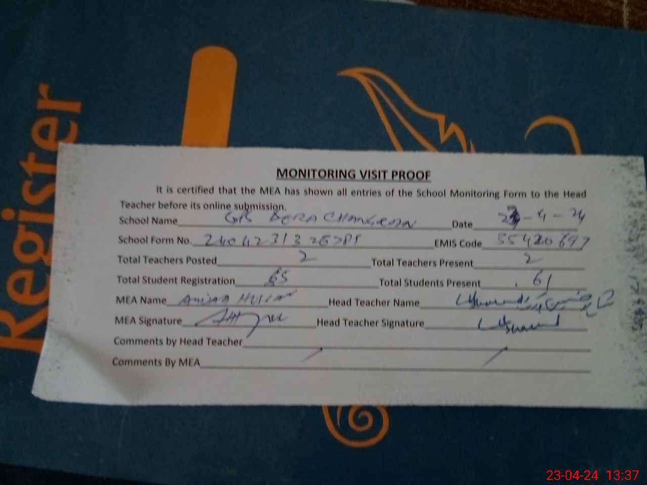 | Attendance Register | Head Teacher | MEA with School | Visit Proof |