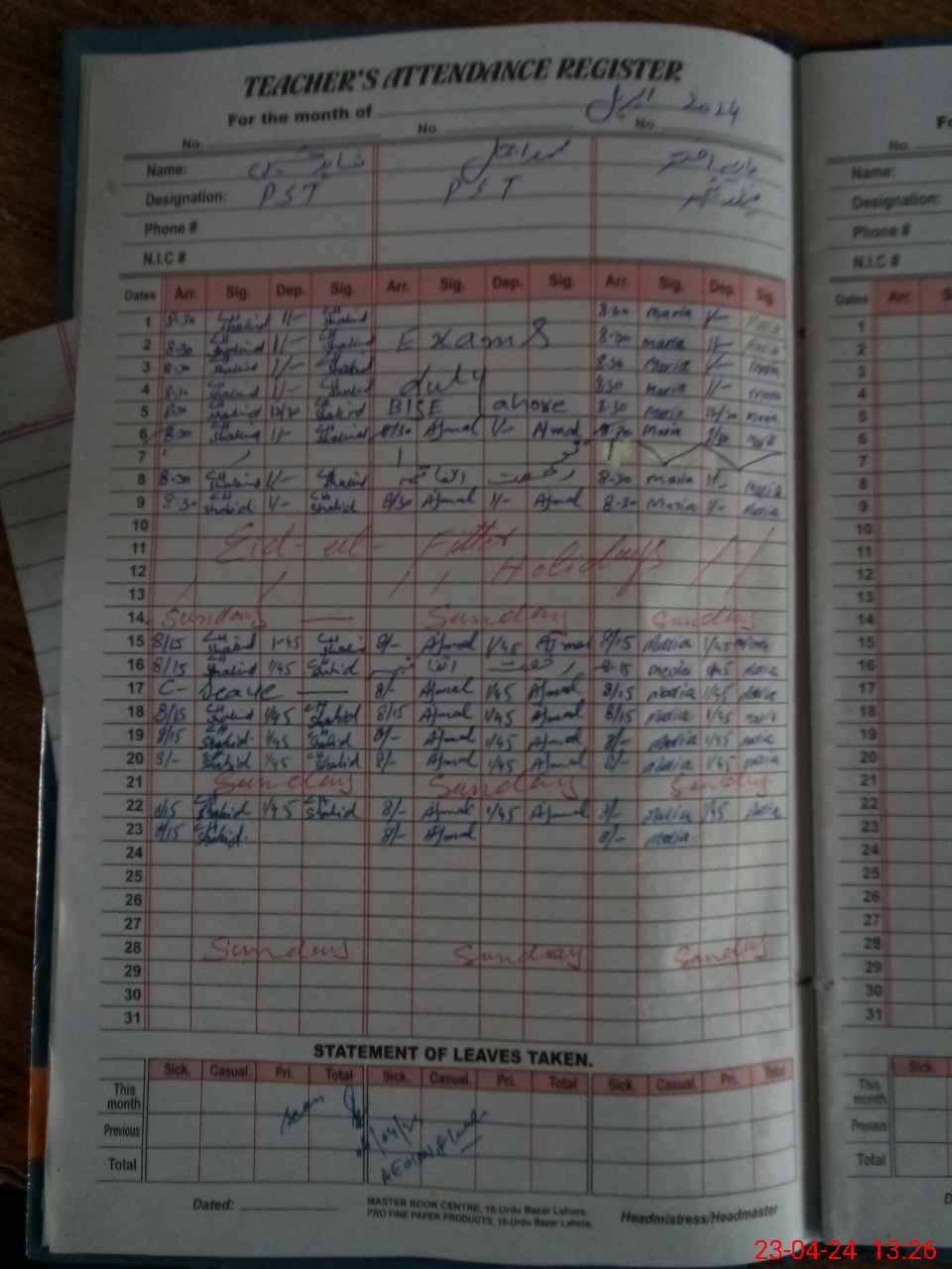 | Leave | Duty | Absent | Maternity | Medical | Ex- Pak |