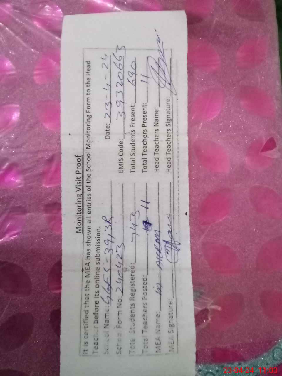 | Attendance Register | Head Teacher | MEA with School | Visit Proof |