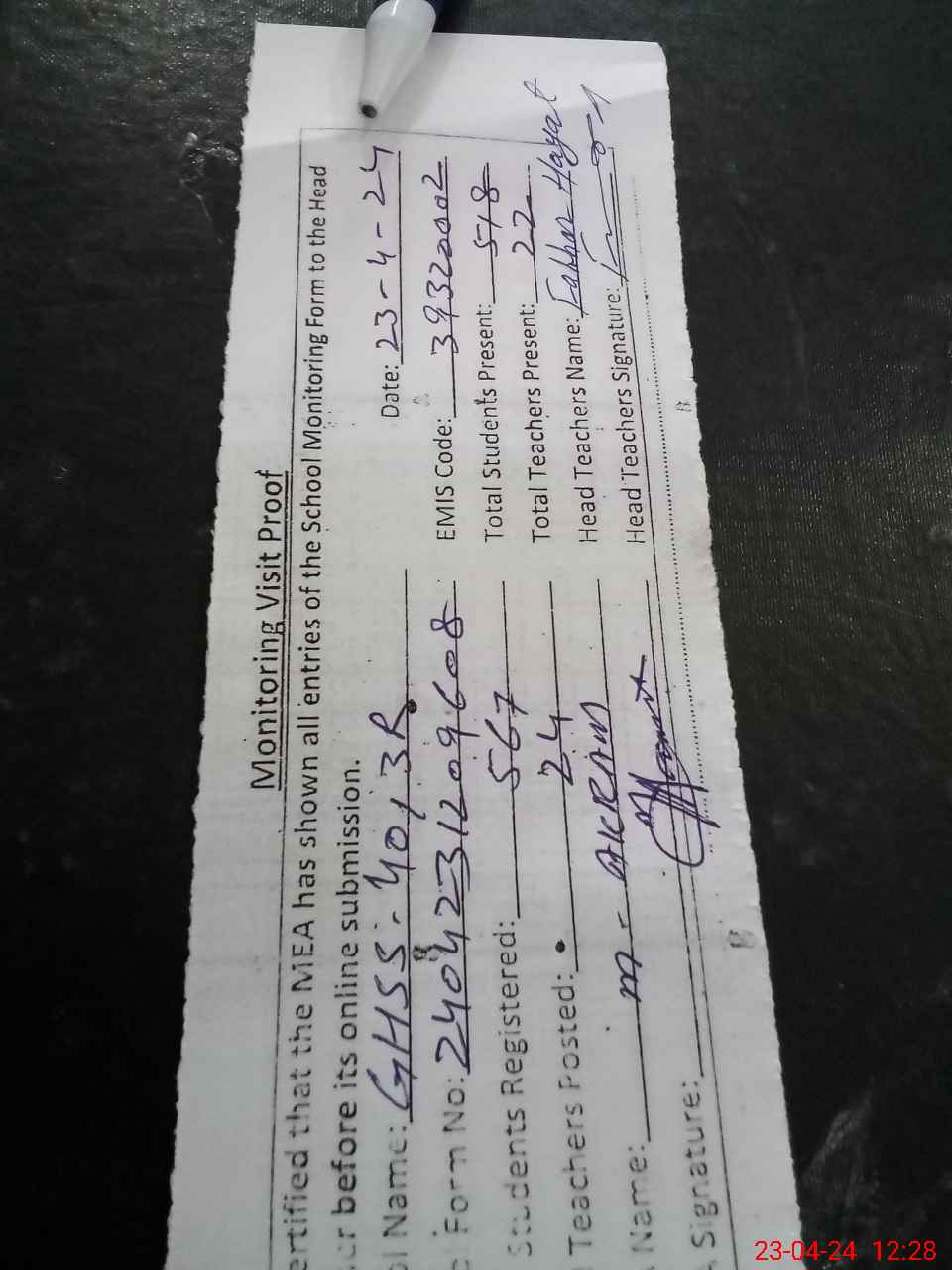 | Attendance Register | Head Teacher | MEA with School | Visit Proof |