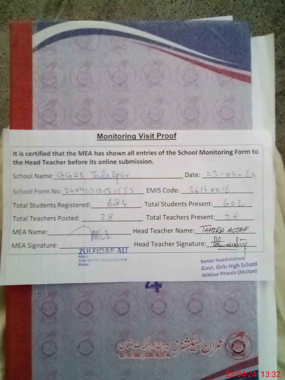 | EMIS Code: 36140016 | Name of School: GGHS JALAL PUR PIRWALA | |||