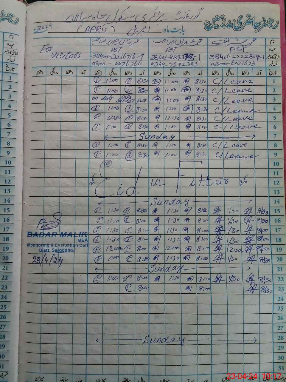 | District: SARGODHA | Tehsil: BHERA | Markaz: CHAK MUBARAK - MALE | Level: Primary | |