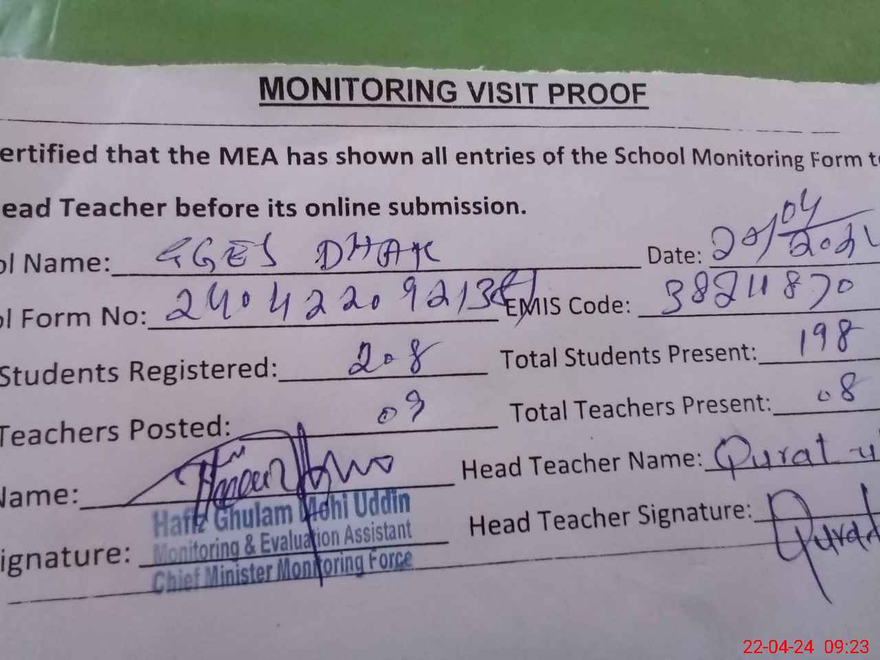 | Attendance Register | Head Teacher | MEA with School | Visit Proof |