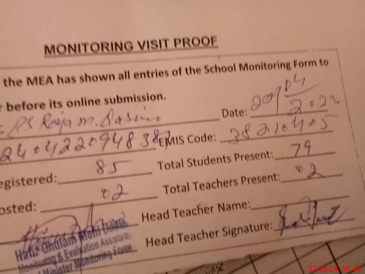| Attendance Register | Head Teacher | MEA with School | Visit Proof |