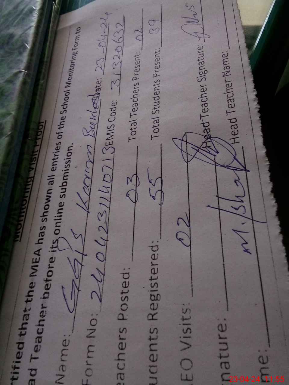 | Attendance Register | Head Teacher | MEA with School | Visit Proof |