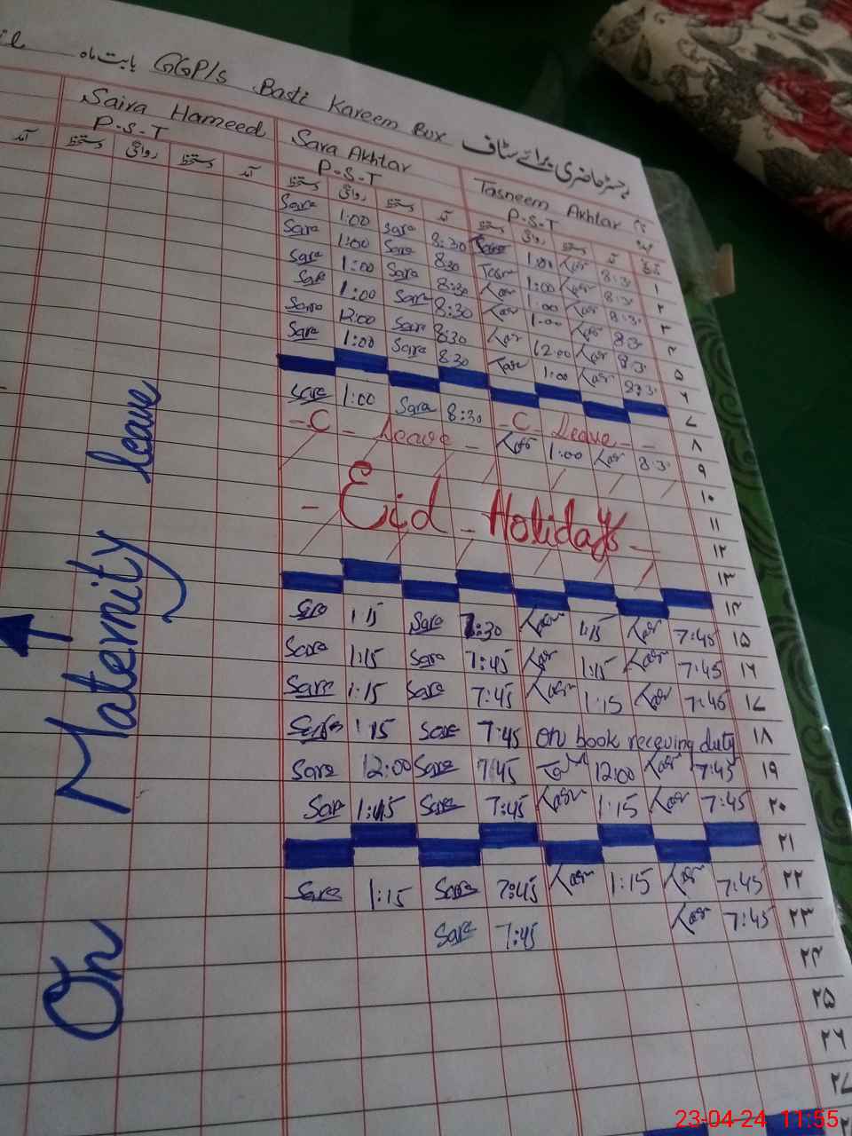 | Leave | Duty | Absent | Maternity | Medical | Ex- Pak |