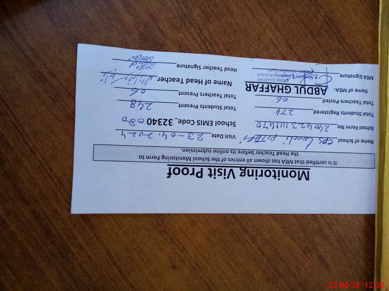 | Attendance Register | Head Teacher | MEA with School | Visit Proof |