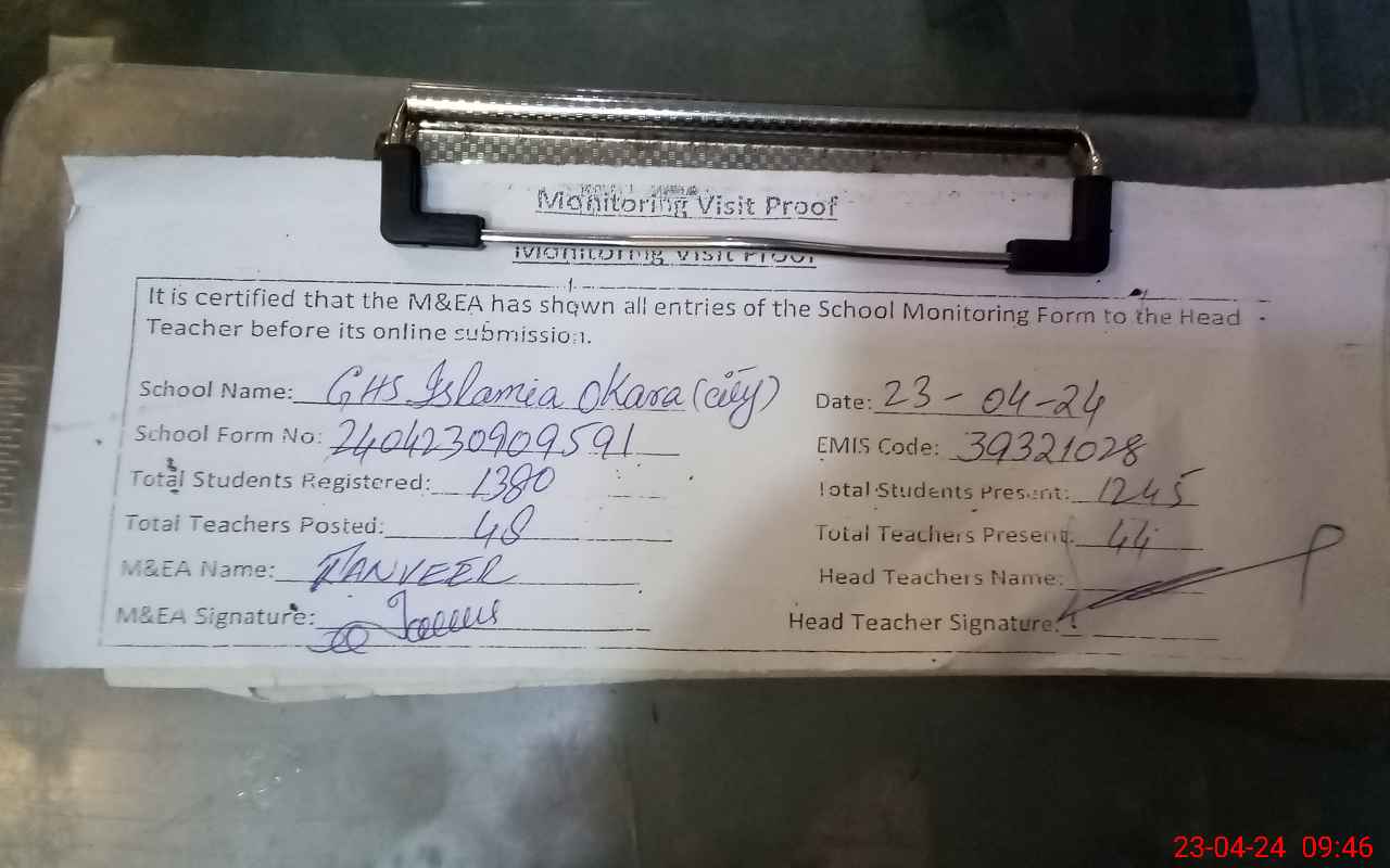 | EMIS Code: 39321028 | Name of School: GHS ISLAMIA OKARA CITY | |||
