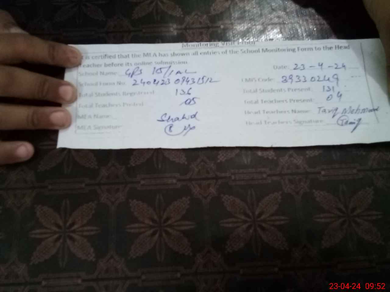 | Name: TA**** ME**** Designation: (School Headmaster's/Headmistress's) HEADMASTER Phone/Cell Number: 03**** |