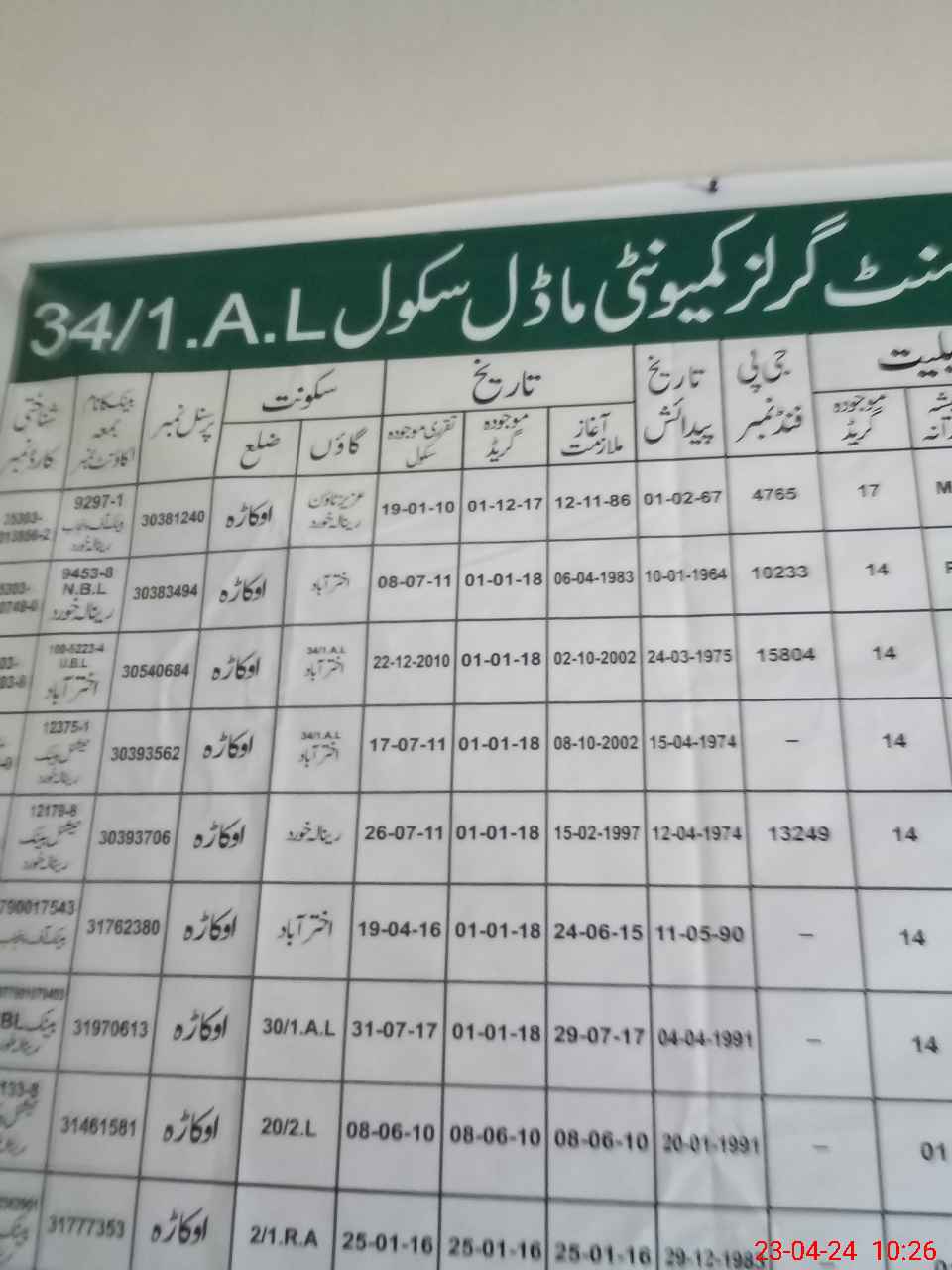 | District: OKARA | Tehsil: RENALA KHURD | Markaz: AKHTAR ABAD - FEMALE | Level: Primary | |