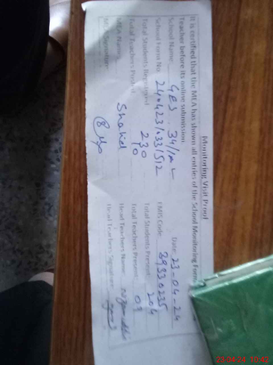 | Attendance Register | Head Teacher | MEA with School | Visit Proof |