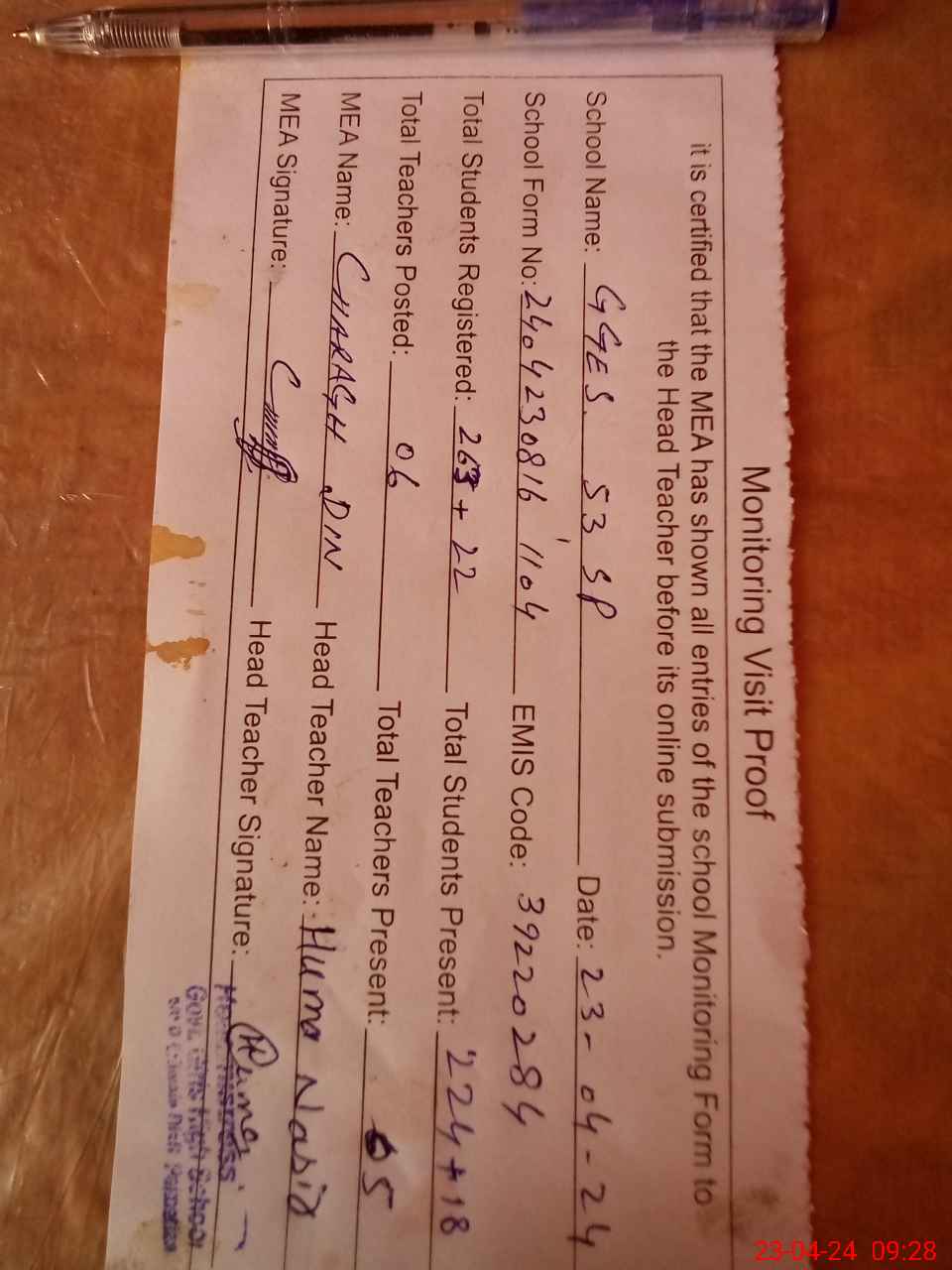 | Attendance Register | Head Teacher | MEA with School | Visit Proof |