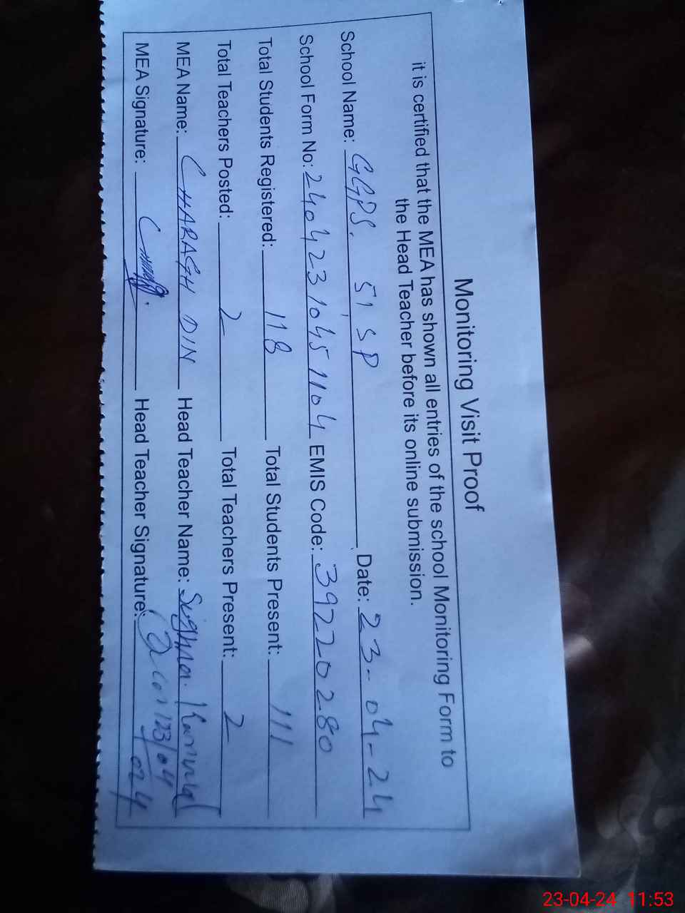 | Attendance Register | Head Teacher | MEA with School | Visit Proof |