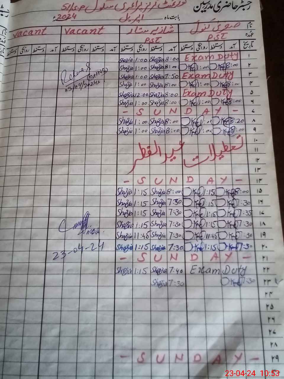 | CNIC | Full Name | Designation | R/C | Absence During Last Calender Month |