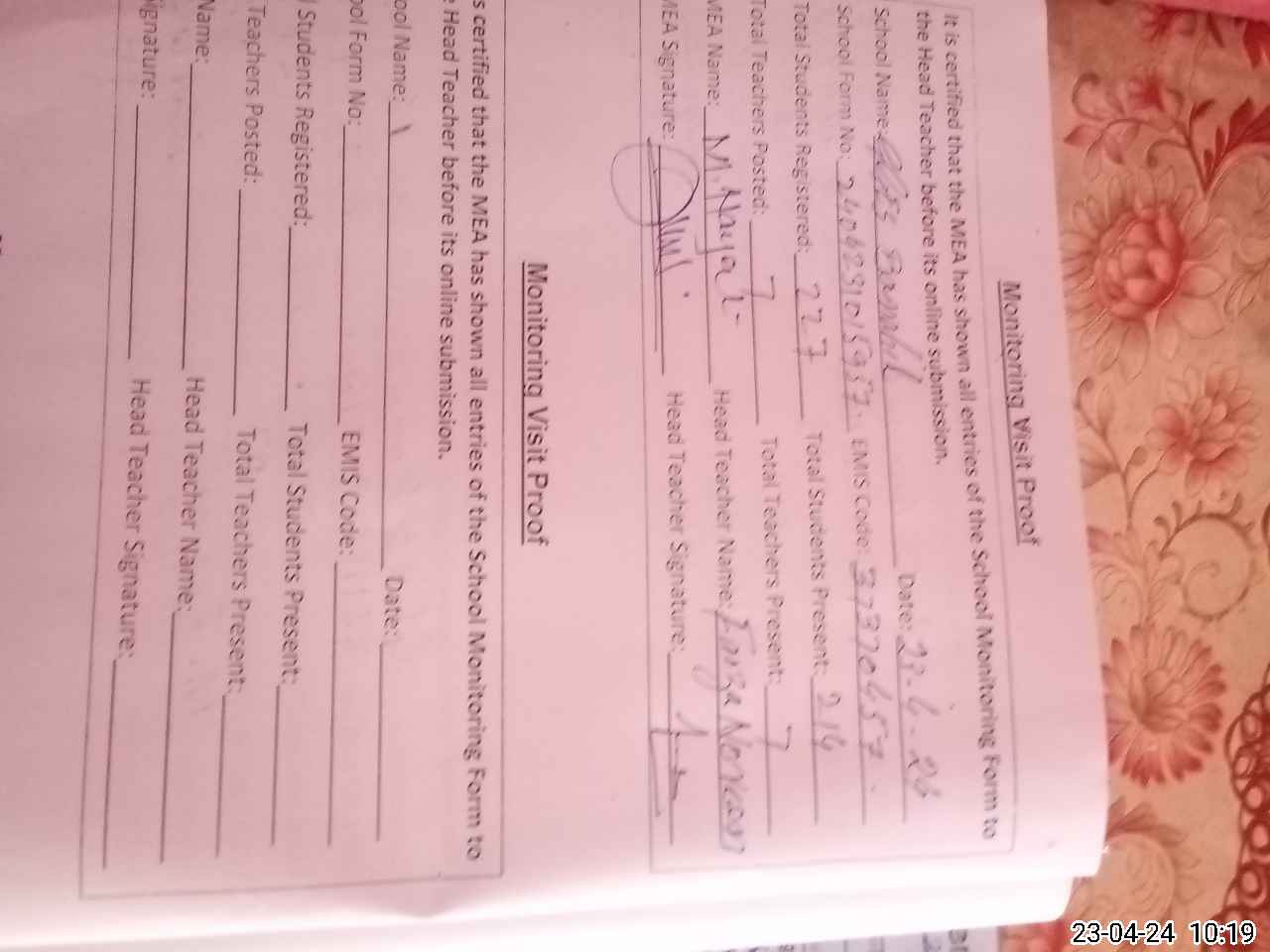 | Certified that this School was Inspected by the Undersigned MEA/DMO Today and the Information Stated Above is as Per Record. | |||||