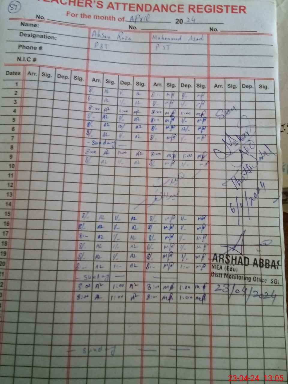 | Name: MU**** AS**** Designation: (School Headmaster's/Headmistress's) PST Phone/Cell Number: 03**** |