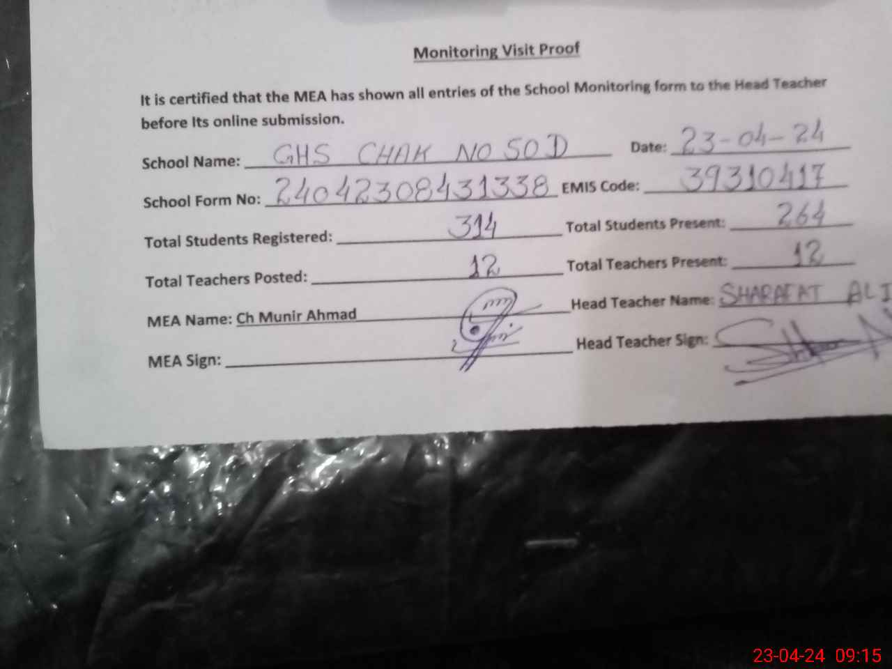 | Attendance Register | Head Teacher | MEA with School | Visit Proof |