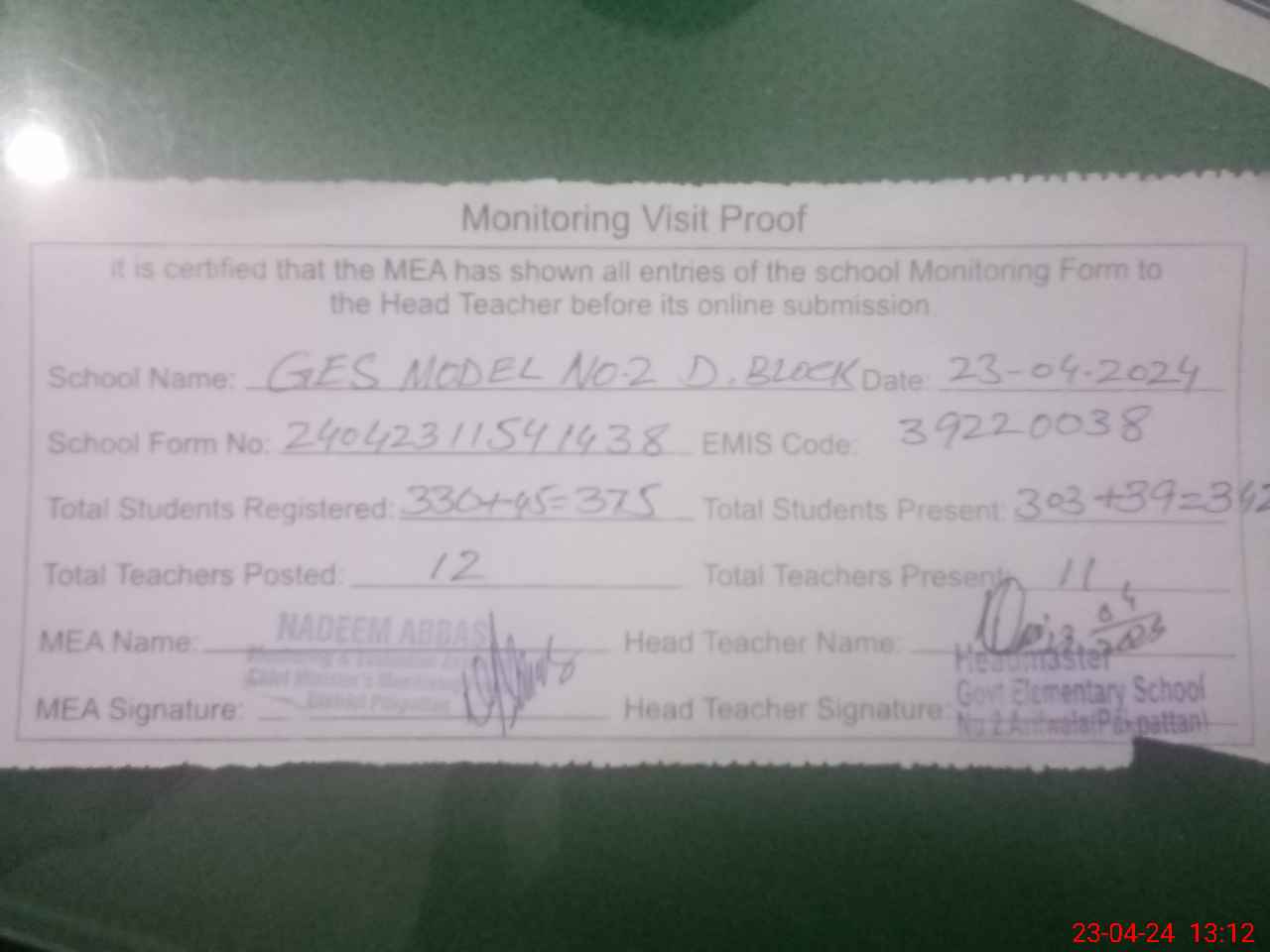 | Attendance Register | Head Teacher | MEA with School | Visit Proof |