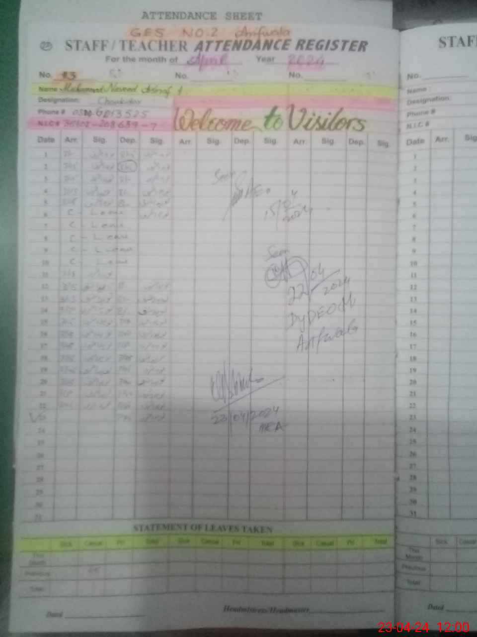 | CNIC | Full Name | Designation | R/C | Absence During Last Calender Month |