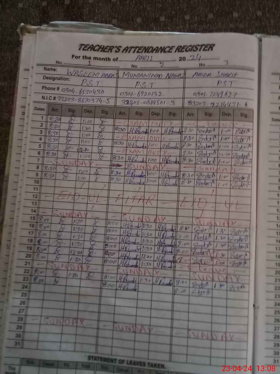 | CNIC | Full Name | Designation | R/C | Absence During Last Calender Month |