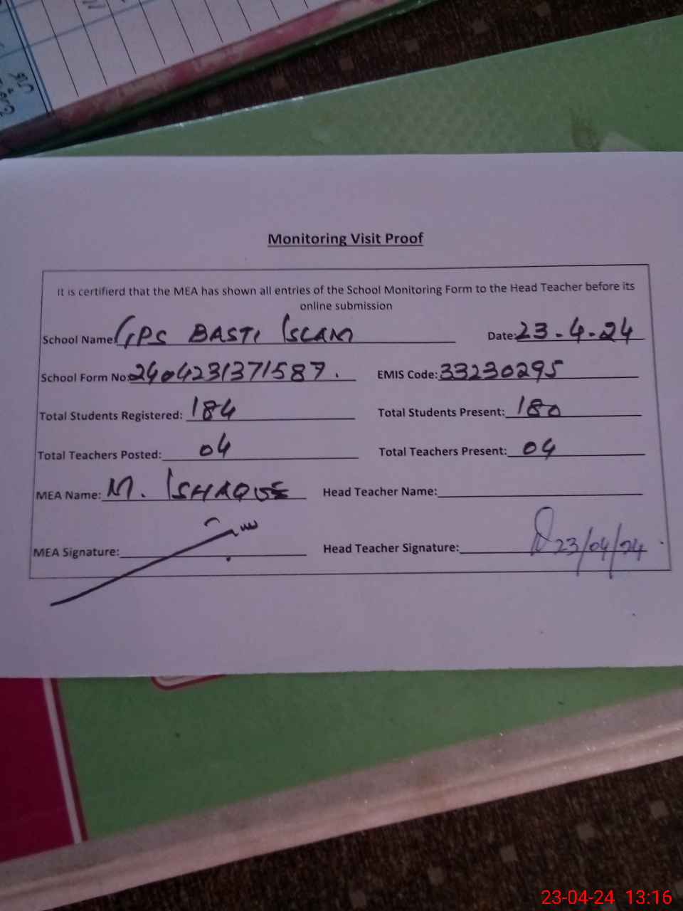 | Attendance Register | Head Teacher | MEA with School | Visit Proof |