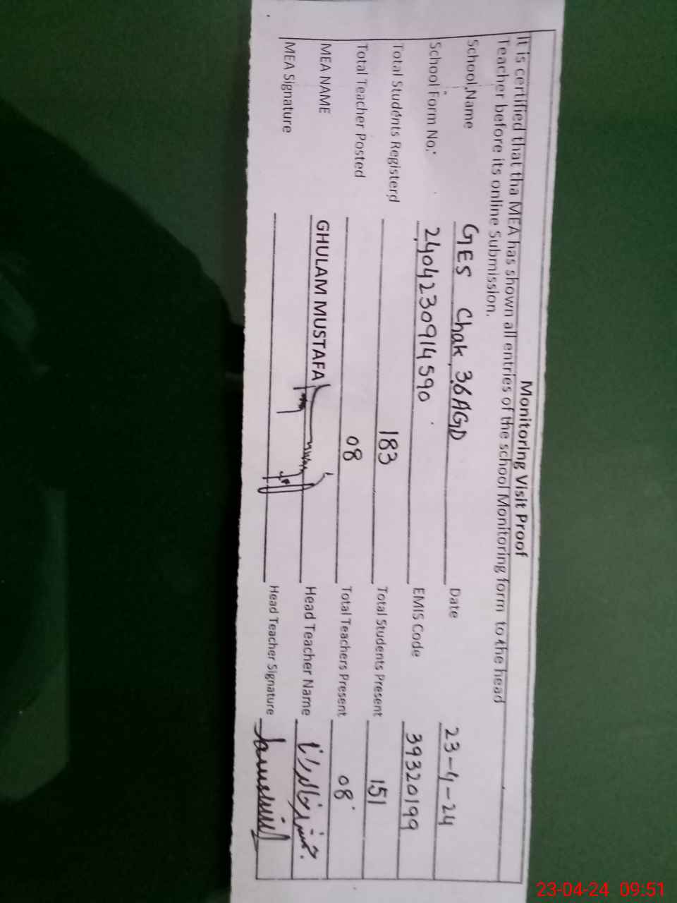 | Attendance Register | Head Teacher | MEA with School | Visit Proof |