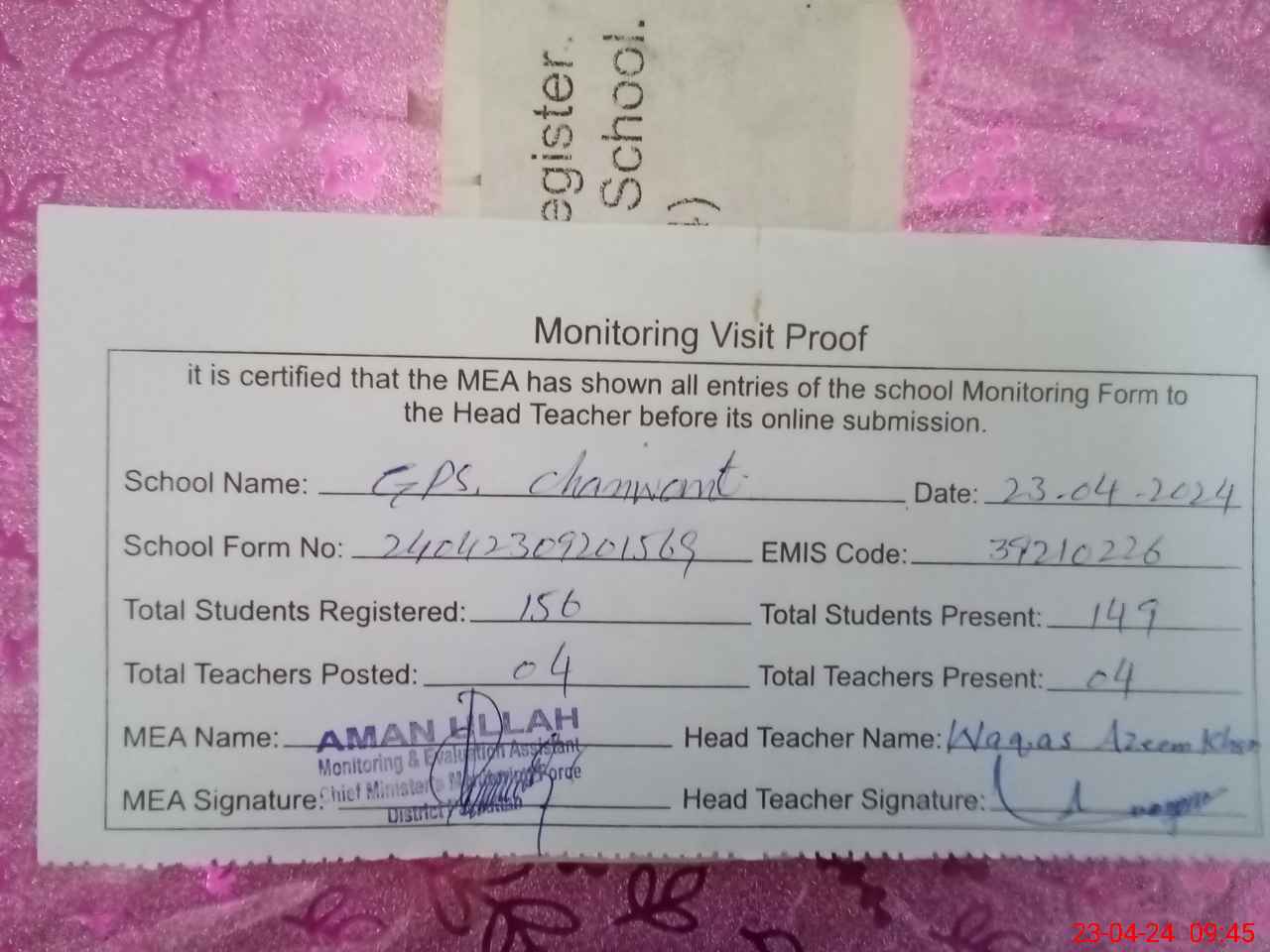 | Attendance Register | Head Teacher | MEA with School | Visit Proof |