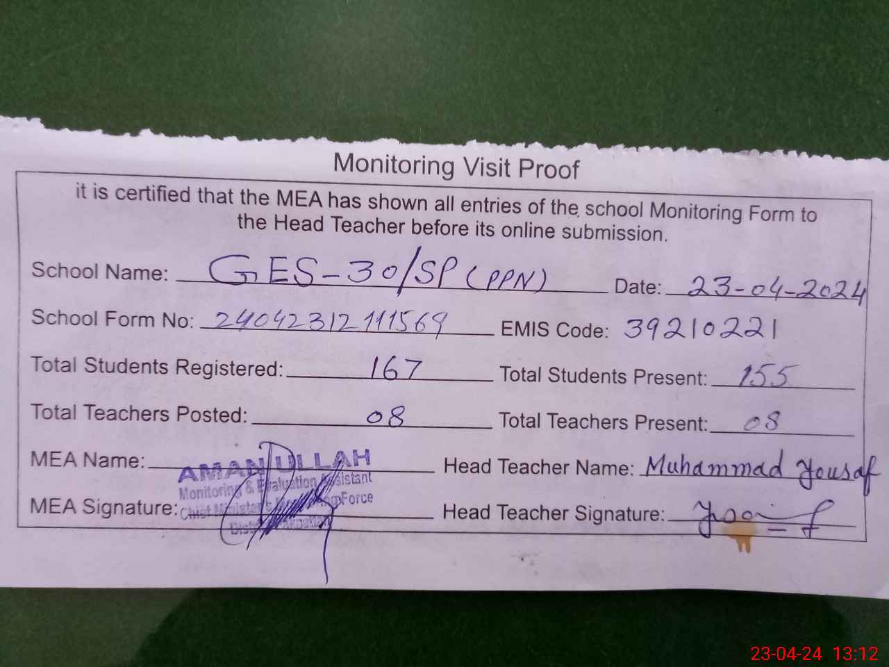 | EMIS Code: 39210221 | Name of School: GES CHAK NO. 30 SP | |||