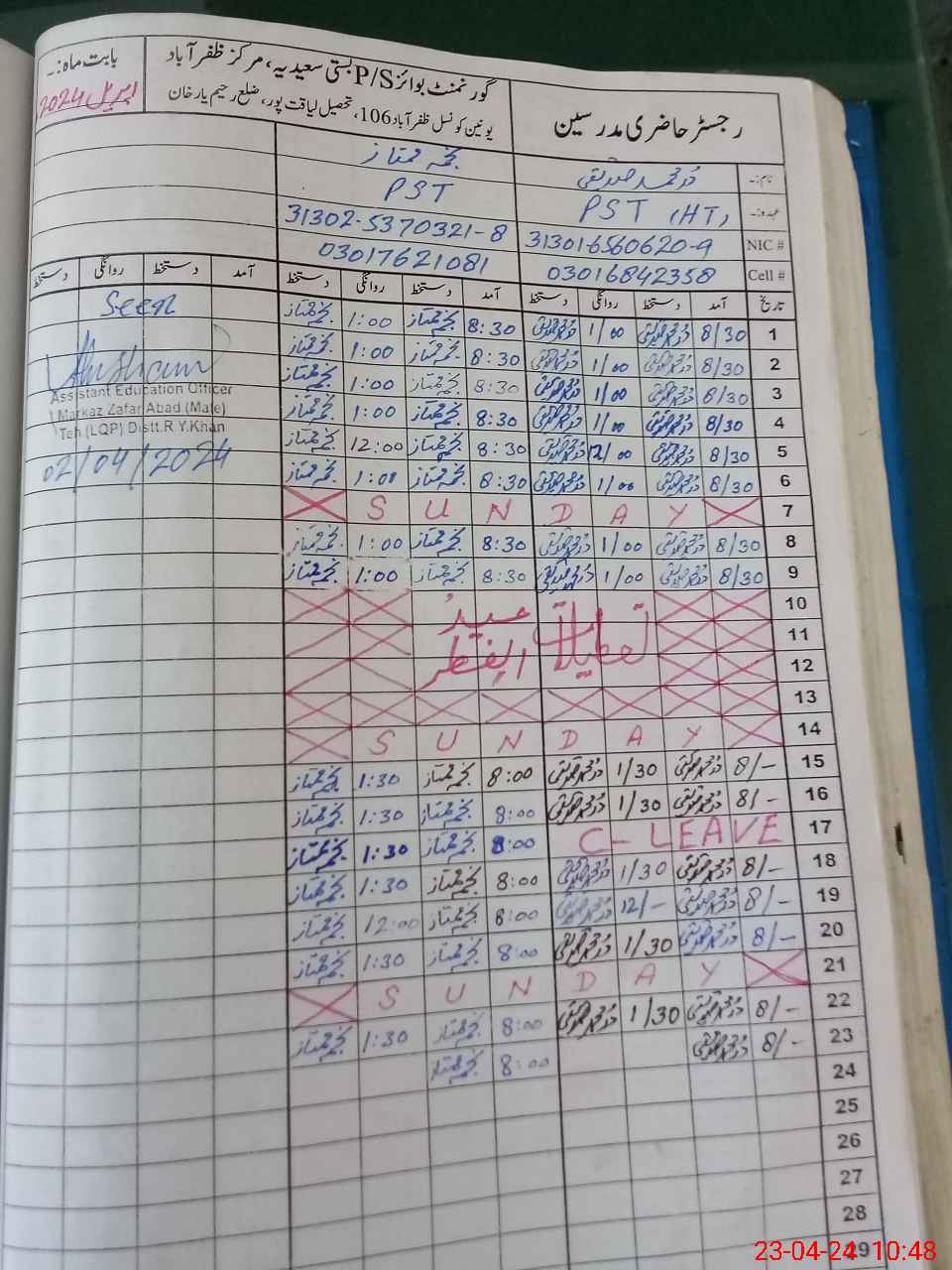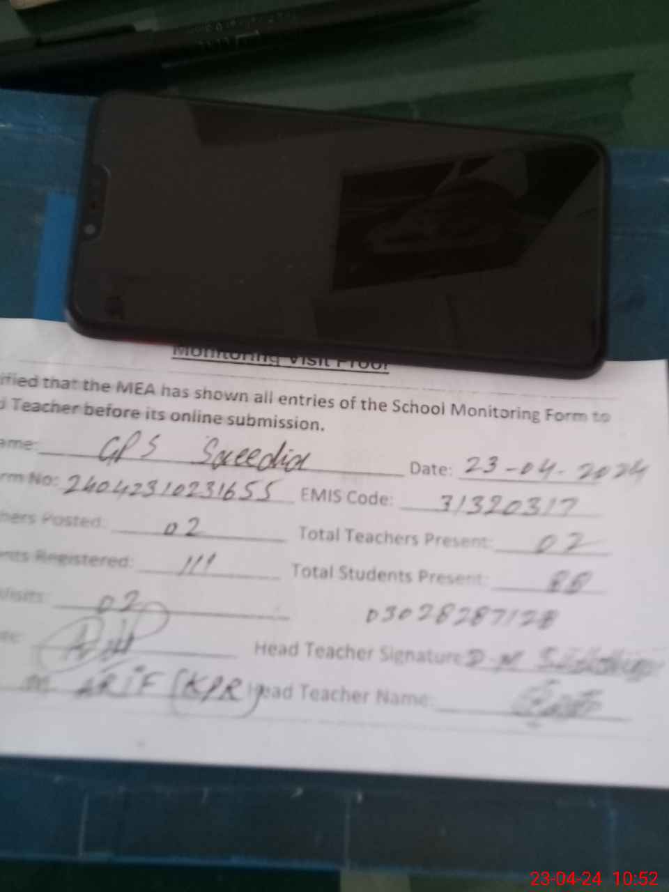 | Name: DU**** MU**** Designation: (School Headmaster's/Headmistress's) PST Phone/Cell Number: 03**** |