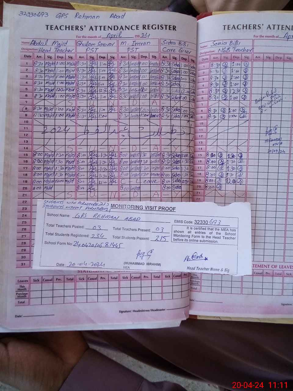 | Attendance Register | Head Teacher | MEA with School | Visit Proof |