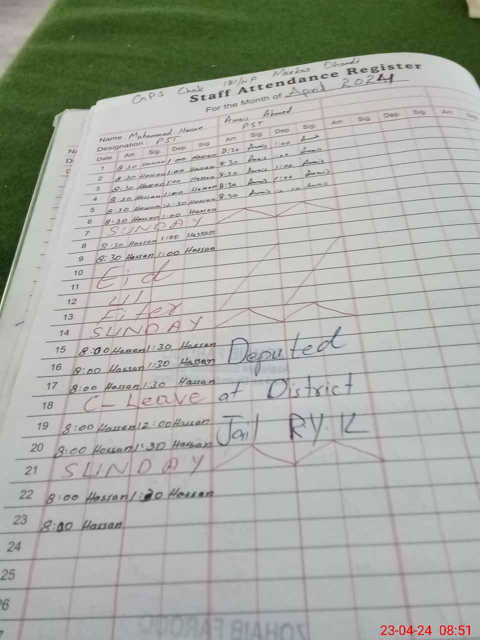 | CNIC | Full Name | Designation | R/C | Absence During Last Calender Month |