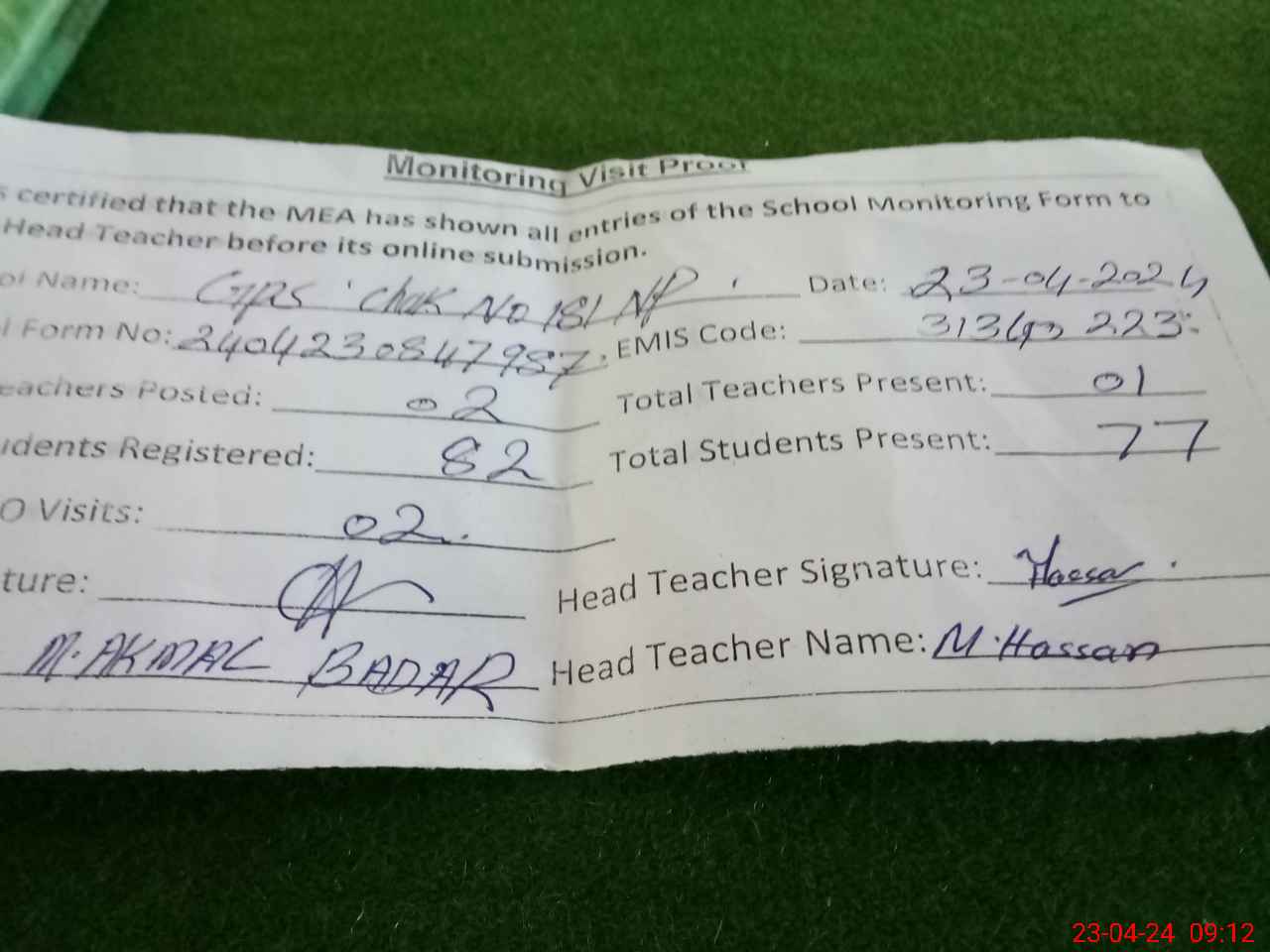 | Attendance Register | Head Teacher | MEA with School | Visit Proof |