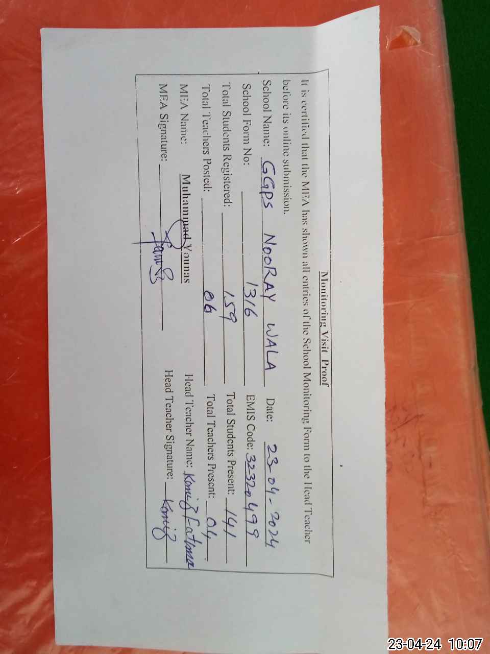 | Attendance Register | Head Teacher | MEA with School | Visit Proof |