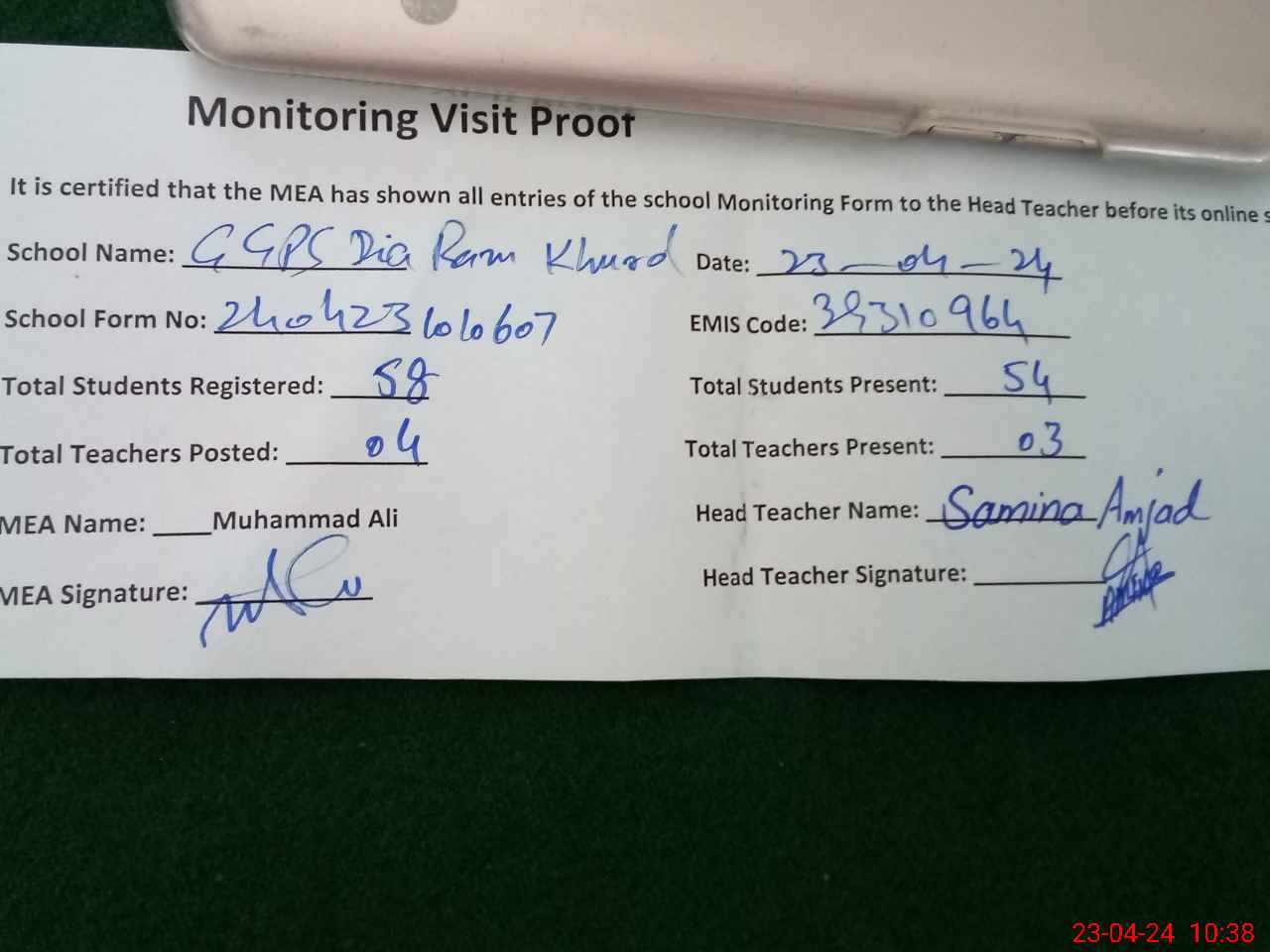 | Attendance Register | Head Teacher | MEA with School | Visit Proof |