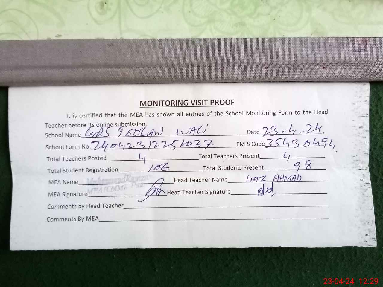 | EMIS Code: 35430494 | Name of School: GPS TOOLAN WALI | |||