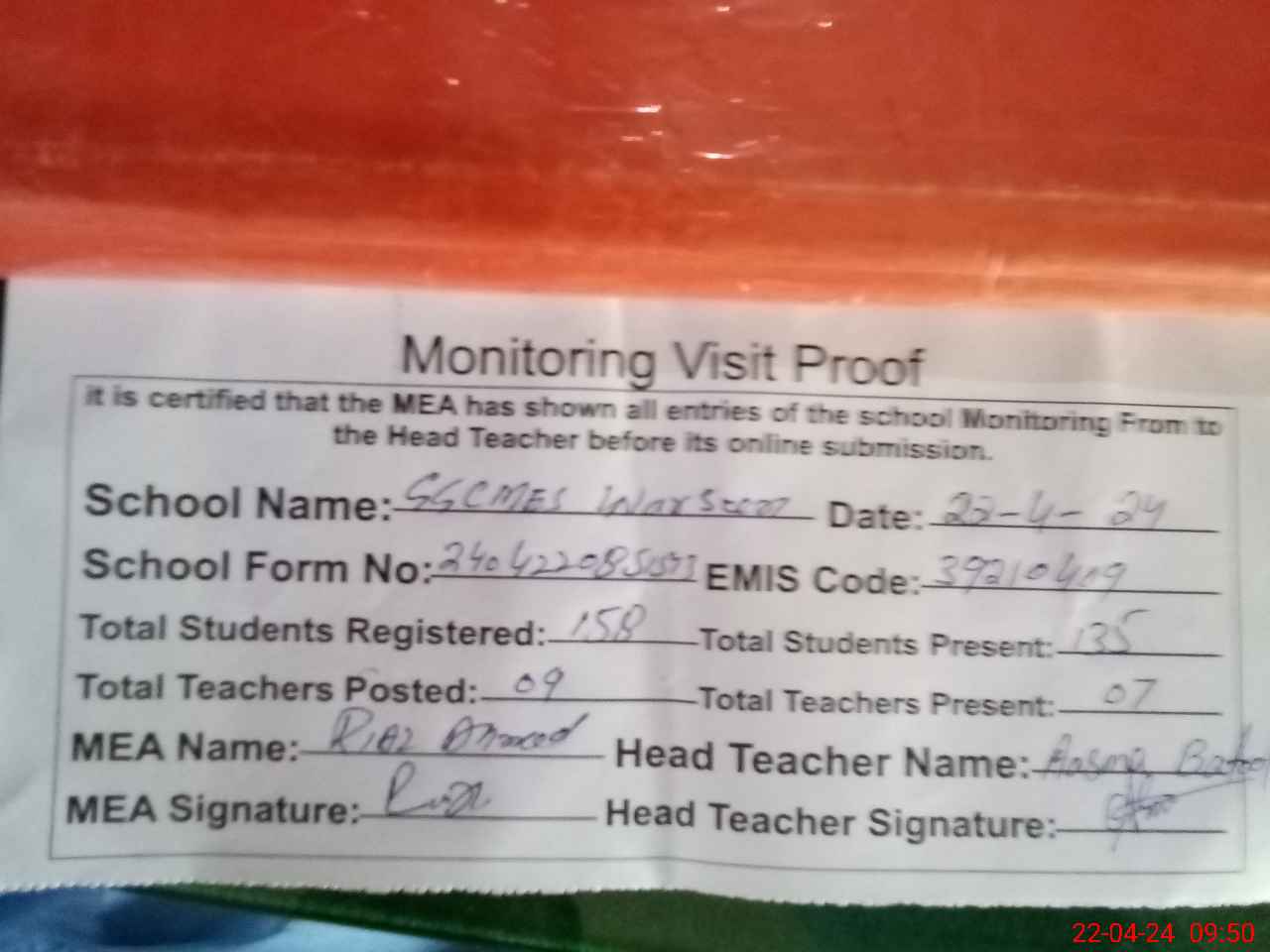 | Attendance Register | Head Teacher | MEA with School | Visit Proof |