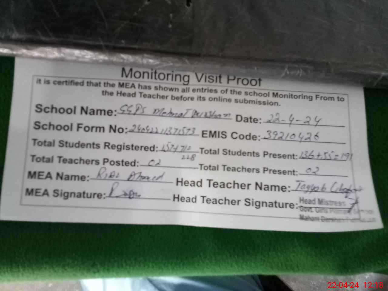 | EMIS Code: 39210426 | Name of School: GGPS CHAK MEHNAT DURSHAN | |||