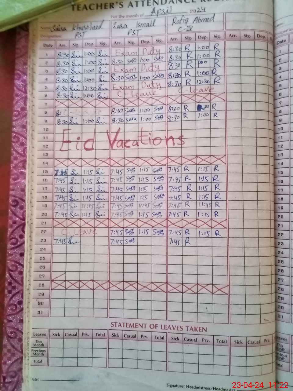 | Leave | Duty | Absent | Maternity | Medical | Ex- Pak |