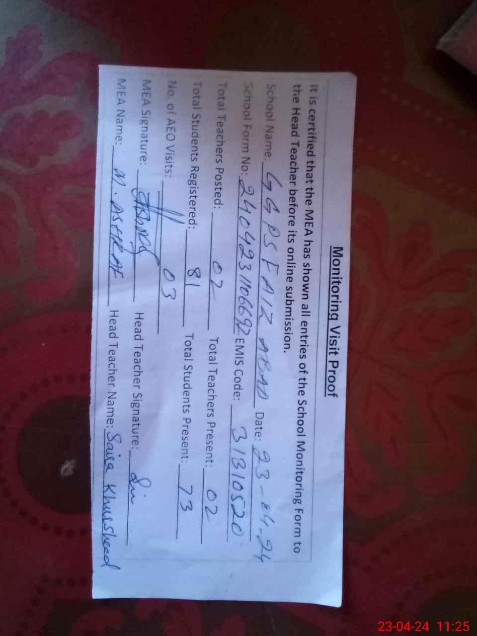 | Attendance Register | Head Teacher | MEA with School | Visit Proof |