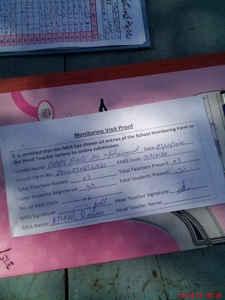 | Attendance Register | Head Teacher | MEA with School | Visit Proof |