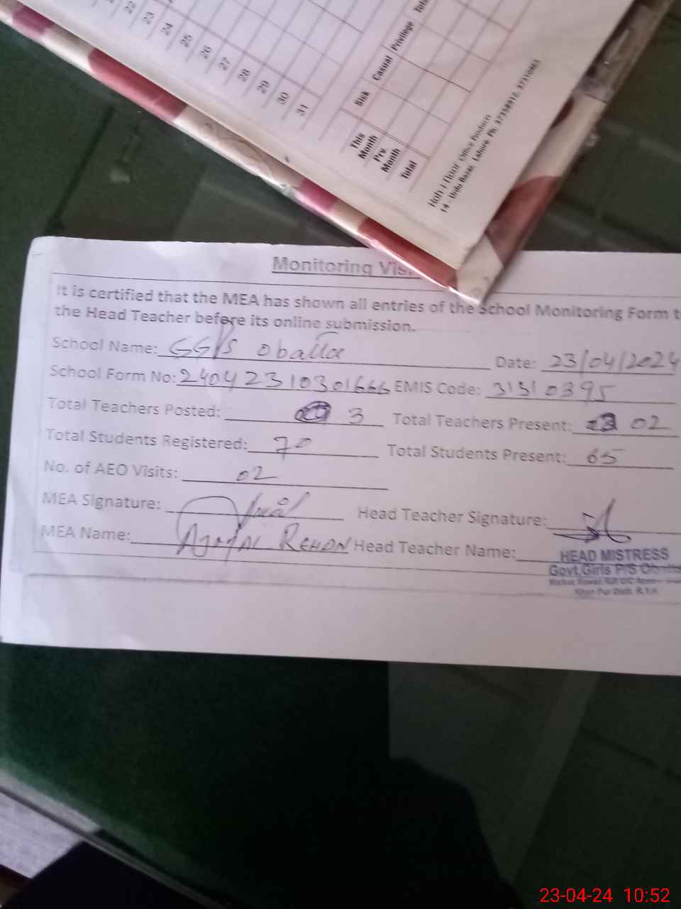 | Attendance Register | Head Teacher | MEA with School | Visit Proof |