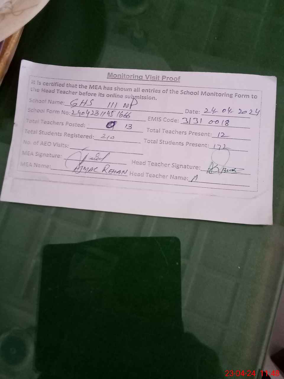 | EMIS Code: 31310018 | Name of School: GHS CHAK 111 NP | |||
