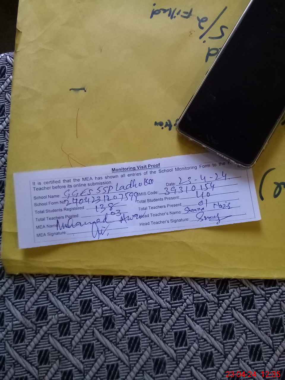 | Attendance Register | Head Teacher | MEA with School | Visit Proof |